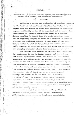 Following a review and evaluation of previous research in the field of international migration for employment, it is argued that the extent to which such migration is beneficial depends critically on how it is organized and by whom. The development of Jordan's traditional image as a regional labour supplier is traced from the early twentieth century and is explained largely in terms of a response to repeated economic and political crises. A case study of the Kuwait labour market is used to demonstrate the recent (post-1978) collapse in Jordanian labour migration and to establish the changing character of the international labour market. The central role assumed by international emigration for employment in the Jordanian economy and the problems; and policy constraints which that places on labour market management are illustrated. An attempt is made to identify scarce skills and to assess the development and utility of the government's policy response towards labour shortages. The scale and characteristics of labour inflows into the Jordanian labour market are established. This reveals the complex role of immigrant workers in an emigrant economy and demonstrates the need for a substantial revision of the 'replacement' labour migration model. The parallel themes of primary labour emigration and secondary labour immigration are explored in a detailed case study of local labour markets and agricultural development in the East Jordan Valley. A concluding chapter summarises the problems of manpower planning and of labour market information: gathering under conditions of heightened uncertainty.