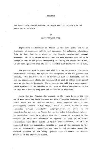 Experience of teaching in France in the late 1950s led to an awareness of excellent methods and resources for religious education. This in turn led to a study of the French catechetical renewal movement. While it became evident that the main movement was led by Fr Joseph Colomb in the years immediately following the Second World War, it was soon apparent that the roots extended much further back in time. The present work is concerned with tracing the roots of the early catechetical renewal, set against the background of the early twentieth century. The influence on it of movements such as Modernism, and of the new educational ideas, are considered as well as others from abroad such as the Munich Movement. The effect of the call for a more gospel based approach in the teaching of religion by Bishop Landrieux of Dijon in 1922 and a moving away from the Catechism is discussed. Among the key figures who emerged in the years between the two world wars were Mme Marie Fargues and Mlle Francoise Derkenne, also Fr André Boyer and Fr Charles Quinet. Their creative activity was particularly intense in the 1930s. Their influence, traced in many instances through unpublished correspondence, is shown to be considerable, not only in France but in the wider international sphere. In particular, there is evidence that their change of approach to the concept of religious education as opposed to that of religious instruction came about sooner in France than elsewhere. It is also suggested that the remarkable tenacity of some of the pioneers in the face of considerable opposition may have helped to bring about the changed attitude to the laity, particularly to women, in certain branches of the Christian Church.