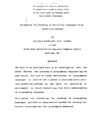 The work to be described here is an investigation into the means whereby the learning of programming languages may be made easier. The role of formal definitions of programming languages is studied and a system is described which utilises production systems as the basis for generating an environment in which students may test their understanding of programming languages. This system for automating the teaching of programming languages provides an experimental testbed for carrying out further investigations into programming behaviour.
