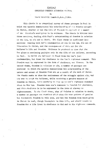 This thesis is an exegetical survey of those passages in Paul in which the Apostle demonstrates his understanding of the freedom wrought in Christ, whether or not the idea of freedom is explicit or a member of the ελευٯερία word-group is in evidence. The thesis is divided into three sections, dealing with Paul's understanding of freedom in relation to the law, to sin and to death. The first theme is subdivided into sections dealing with God's condemnation of sin in the law. His act of liberation in Christ, and the consequences of this act for the believer's life and freedom. Evidence is produced to show that the law plays a continuing positive role in the life of the believer, according to Paul. In Christ the believer is freed from the law's just condemnation, but freed for obedience to the law's righteous command. This freedom must be expressed in the form of obedience, not licence. In the second theme, freedom in relation to sin, a number of passages are examined in which the Apostle demonstrates his understanding of the nature and extent of freedom from sin as a result of the work of Christ. The thesis seeks to show the seriousness of the struggle against sin, and the way in which the believer, while receiving a genuine measure of freedom in Christ, fails woefully to live up to God's righteous standard shown in his law. Freedom from sin's dominion is freedom for obedience, and this obedience is to be expressed in the form of slavery to righteousness. In the final theme, that of freedom in relation to death, a number of passages are examined which show the same pattern of genuine but incomplete freedom in this area, and how the freedom from death given in Christ is real, though incomplete in this life, and should result in freedom for a life lived in obedience to God and to His righteous commands.