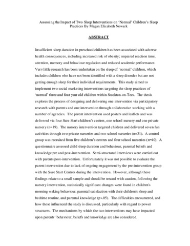 Insufficient sleep duration in preschool children has been associated with adverse health consequences, including increased risk of obesity; impaired reaction time, attention, memory and behaviour regulation and reduced academic performance. Very little research has been undertaken on the sleep of ‘normal’ children, which includes children who have not been identified with a sleep disorder but are not getting enough sleep for their individual requirements. This study aimed to implement two social marketing interventions targeting the sleep practices of ‘normal’ three and four year old children within Stockton-on-Tees. The thesis explores the process of designing and delivering one intervention via participatory research with parents and one intervention through collaborative working with a number of agencies. The parent intervention used posters and leaflets and was delivered via four Sure Start children’s centres, one school nursery and one private nursery (n=19). The nursery intervention targeted children and delivered seven fun activities through two private nurseries and two school nurseries (n=31). A control group was recruited from five children’s centres and four school nurseries (n=40). A questionnaire assessed child sleep duration and behaviour, parental beliefs and knowledge pre and post-intervention. Semi-structured interviews were carried out with parents post-intervention. Unfortunately it was not possible to evaluate the parent intervention due to lack of ongoing engagement by the pre-intervention group with the Sure Start Centres during the intervention. However, although these findings relate to a small sample and should be treated with caution, following the nursery intervention, statistically significant changes were found in children's morning waking behaviour, parental satisfaction with their children's sleep and bedtime routine, and parental knowledge (p<.05). The difficulties encountered, and how these influenced the study is discussed, particularly with regard to power structures. The mechanisms by which the two interventions may have impacted upon parents’ behaviour, beliefs and knowledge are also considered.