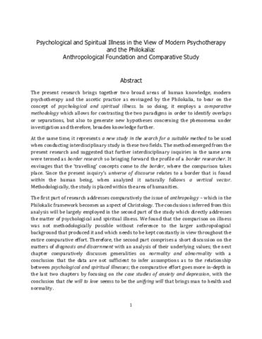 The present research brings together two broad areas of human knowledge, modern psychotherapy and the ascetic practice as envisaged by the Philokalia, to bear on the concept of psychological and spiritual illness. In so doing, it employs a comparative methodology which allows for contrasting the two paradigms in order to identify overlaps or separations, but also to generate new hypotheses concerning the phenomena under investigation and therefore, broaden knowledge further. At the same time, it represents a new study in the search for a suitable method to be used when conducting interdisciplinary study in these two fields. The method emerged from the present research and suggested that further interdisciplinary inquiries in the same area were termed as border research so bringing forward the profile of a border researcher. It envisages that the ‘travelling’ concepts come to the border, where the comparison takes place. Since the present inquiry’s universe of discourse relates to a border that is found within the human being, when analyzed it naturally follows a vertical vector. Methodologically, the study is placed within the area of humanities. The first part of research addresses comparatively the issue of anthropology – which in the Philokalic framework becomes an aspect of Christology. The conclusions inferred from this analysis will be largely employed in the second part of the study which directly addresses the matter of psychological and spiritual illness. We found that the comparison on illness was not methodologically possible without reference to the larger anthropological background that produced it and which needs to be kept constantly in view throughout the entire comparative effort. Therefore, the second part comprises a short discussion on the matters of diagnosis and discernment with an analysis of their underlying values; the next chapter comparatively discusses generalities on normality and abnormality with a conclusion that the data are not sufficient to infer assumptions as to the relationship between psychological and spiritual illnesses; the comparative effort goes more in-depth in the last two chapters by focusing on the case studies of anxiety and depression, with the conclusion that the will to love seems to be the unifying will that brings man to health and normality.