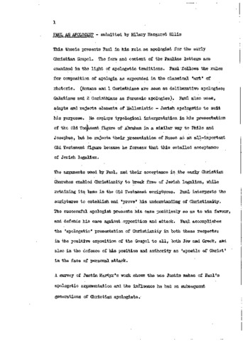 This thesis presents Paul in his role as apologist for the early Christian Gospel. The form and content of the Pauline letters are examined in the light of apologetic traditions. Paul follows the rules for composition of apologia as expounded in the classical 'art' of rhetoric. (Romans and 1 Corinthians are seen as deliberative apologies; Galatians and 2 Corinthians as forensic apologies). Paul also uses, adapts and rejects elements of Hellenistic - Jewish apologetic to suit his purposes. He employs typological interpretation in his presentation of the Old Testament figure of Abraham in a similar way to Philo and Josephus, but he rejects their presentation of Moses as an all-important Old Testament figure because he foresaw that this entailed acceptance of Jewish legalism. The arguments used by Paul, and their acceptance in the early Christian Churches enabled Christianity to break free of Jewish legalism, while retaining its base in the Old Testament scriptures. Paul interpret the scriptures to establish and 'prove' his understanding of Christianity. The successful apologist presents his case positively so as to win favour, and defends his case against opposition and attack. Paul accomplishes the 'apologetic' presentation of Christianity in both these respects: in the positive exposition of the Gospel to all, both Jew and Greek, and also in the defence of his position and authority as 'apostle of Christ' in the face of personal attack. A survey of Justin Martyr's work shows the use Justin makes of Paul's apologetic argumentation and the influence he had on subsequent generations of Christian apologists