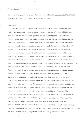 The frame of the Poor Law amendment Act of 1834 envisaged that, under the reformed relief system, with its tenet of 'less eligibility', the problem of able-bodied pauperism would disappear. The thesis investigates the relief of able-bodied poor in North Yorkshire, in the period c 1834-1900, and asks whether the New Poor Law, as it operated in this rural northern region, was successful in terms of the aims of 'l834'. The interest of such a regional study lies in the unique problems of poverty, associated with do-industrialisation, which were typical of neither the rural south nor the northern industrial towns - areas which have received considerable attention from both contemporary poor law commentators and historians. The first chapter is concerned with the process of de-industrialisation - the timing and extent of the decline of rural industries, the size and distribution of their labour force, in addition to their rates of wages and employment. The interaction between central and local poor law authorities in the administration of able-bodied poor relief in North Yorkshire forms the subject of chapter two, while chapter three examines in more detail the pressure exerted on the poor relief system by different groups of able- bodied poor in the period of de-industrialisation. Finally, the relative importance of poor law relief in the lives of the able-bodied poor is considered. Concentrating on just one aspect of the new Poor Law and attempting to relate socio-economic developments to the administration of poor relief necessitated sifting through much primary poor law material for only a modest return and analysing; de-industrialisation in more detail than is possible from secondary sources alone.