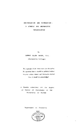 Section one of this thesis is concerned with the kinetics and mechanism of the process of denitrosation. At high concentrations of sufficiently reactive nucleophiles the rate of reaction of several N-alkyl-N-nitrosoanilines becomes independent of both the nature and the concentration of such species. This has been intrepreted in terms of a shift in the rate-determining to an earlier one in the reaction pathway, namely the protonation. Support for such a proposal comes from the solvent isotope effects K(_H(_2)O) : K(_D(_2)O) of 1.4 and 0.7, respectively. The denitrosation of D,L-N-acetyl-N-nitrosotryptophan (NANT) has been studied in water in the acid range 4 x 10(^-2) - 1M H(_2)SO(_4) and also at the lower acidities in buffer solution pH 2-6. The reaction was irreversible, giving D,L=N-acetyltryptophan (NAT) and nitrous acid quantitatively. At higher acidities the rate of reaction was independent of added parent amine NAT and also of the addition of various nucleophiles. The kinetic solvent isotope effect k(_H(_2)O) : k(_D(_2)O) was 1.3 and 1.1 at 0.7M H(_2)SO(_4) and 0.1M H(_2)SO(_4), respectively. At pH 6, however, the addition of various nucleophiles did catalyse the reaction, with increasing efficiency along the series C1(^-)<Br(^-)<SCN(^-)< 1(^-)~(^N)3(^-). As the concentration of nucleophile increased the reaction rate constant tended to become independent of the [nucleophile]. The results arc discussed in terms of two acid-catalysed reaction pathways, one predominate in the region pH 4-7 and the other at acidities greater than pH 1, as clearly shown by the pH - rate profile. At the higher acidities, N.ANT was used to nitrosate 4 - nitroaniline but only in the absence of a nitrous acid trap, thereby implicating the intermediacy of free nitrous acid. Section two is concerned with the reverse process, nitrosation. Thioureais shown to be a very efficient catalyst in the nitrosation of morpholine in acid solution. Compared with other known catalysts the order of efficiency