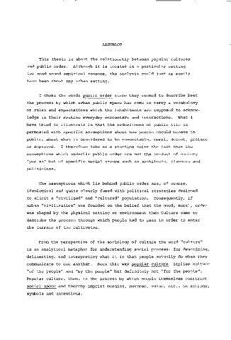 This thesis is about the relationship between popular cultures and public order. Although it is located in a particular setting for good sound empirical reasons, the analysis could just as easily have been about any urban setting. I chose the words public order since they seemed to describe best the process by which urban public space has come to carry a vocabulary or rules and expectations which the inhabitants are supposed to acknowledge in their routine everyday encounters and interactions. What I have tried to illustrate is that the orderliness of public life is permeated with specific assumptions about how people should behave in public; about what is considered to be respectable, moral, decent, profane or depraved. I therefore take as a starting point the fact that the assumptions which underlie public order are not the product of society 'per se' but of specific social groups such as architects, planners and politicians. The assumptions which lie behind public order are, of course, ideological and quite clearly fused with political strategies designed to elicit a "civilised" and "cultured" population. Consequently, if urban "civilization" was founded on the belief that the good, moral, order was shaped by the physical setting or environment then Culture came to describe the process through which people had to pass in order to enter the terrain of the cultivated. From the perspective of the sociology of culture the word "culture" is an analytical metaphor for understanding social process: for describing, delineating, and interpreting what it is that people actually do when they communicate to one another. Seen this way popular culture implies culture "of the people" and "by the people" but definitely not "for the people". Popular culture, then, is the. process by which people themselves construct social space and thereby imprint meaning, purpose, value, etc., on actions, symbols and intentions.