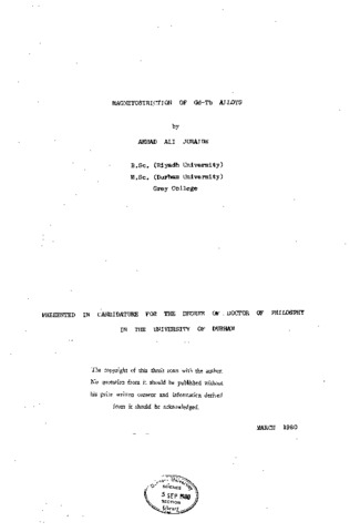 The work described in this thesis is directed towards study of the magnetostriction in the Gd-Tb alloy system using resistive strain gauge technique. The experiments were carried out at various ranges of temperatures between 4.5 K and 250 K, and magnetic fields up to 13 Tesla were available. High quality single crystals of Gd(_0.95)Tb(_0.05') Gd(_0.80)Tb(_0.20')Gd(_0.50)Tb(_0.50), and Gd(_0.25)Tb(_0.75) were used to measure the four magnetostriction coefficients λ(^y,2), λ(^a,2)(_2), λ(^a,2)(_1) and λ(^E,2) temperature dependences of the magnetostriction coefficients were fitted with both single-ion mechanism and a theory containing a term representing a two-ion interaction. Only the values of the magnetostric tion coefficients for the samples containing high concentration of Terbium obey the single-ion I5/2 [ £(^-1)(m(_n))]. However, the experimental results were better fitted using the other theory, but in most cases the fit was less close than could have been desired. An anomalous behaviour was observed for the samples containing 5% and 20% of Terbium in the magnetostriction curves along the c-axis, 45 to c-axis, and b-axes in the b-c plane. These anomalies disappeared by raising the field and temperature above 70-K. Another anomaly was observed in the temperature dependence of λ(^a,2)(_2) for the sample containing 20% of Terbium where a very sharp peak was obtained for this coefficient at 60 K. The variation of the coefficients λ(^y),2, λ(^a,2)(_2) with alloy composition were able to be represented using an exponential relation, while a linear relation was found for the coefficient λ(^a,2)(_I). The values of the coefficients extrapolated well to the values of the pure metalsgiven by previous workers. The ratio λ(^e,2)(o) / λ(^y,2)(_o) was found to have anomalously large values compared with that expected for the heavy rare earth metals and increase with increasing Terbium concentration in the alloy.