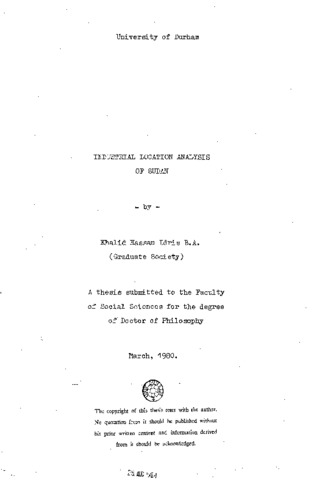 The present study is a modest attempt to analyse industrial location in Sudan, and to explain existing location patterns and industrial localization. Future industrial location trends are examined in the light of past and present development. The commitment to non-industrialisation in Sudan during the colonial regime has had a pronounced impact on the post independence spatial distribution of industry. Thus investment policies and development in the pre-independence period are investigated with reference to the set objectives and prevailing opportunities in Chapter Two. Private capital investment was insignificant compared with the public sector which was under taking 'commercial plantation' and infrastructural capital outlay. However, business and trade was the domain of private entrepreneurship. Public and private sectors were nonetheless complementary to each other and their activities were co-ordinated in what is termed the 'charter government system'. Structural transformation and economic growth (Chapter Three) is seen as a manifestation of this co-ordination and partnership. Planned non industrialisation, 'growth through trade', and primary export base are all attributed to the development endeavour of this period. An industrial location theory specific to developing countries is expounded in the Prime Base theory (Chapter Pour). Localization of industry according to this theory seems inevitable in many other prime bases of developing countries. In the second part, Sudan's industrial activity is investigated within the context of contemporary urban and regional development. In Chapter Five the spatial organisation of the industrial activity in the Prime Base is analysed in some detail, and the regional distribution and pattern of industry in Sudan is examined in Chapter Six. The emergence of secondary bases is seen as part of the economic process, and could be developed to realise industrial regionalisation. Chapter Seven is a case study of cotton-seed oil to test existing localization as against the 'theoretical optimum' according to classical location theory. Chapter Eight analyses human and natural resources in relation to regional development and future prospects for industrial location. Some suggestions are offered, and policy issues are raised in the concluding remarks.