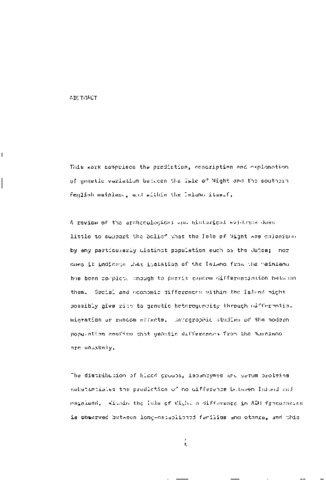 This work comprises the prediction, description and explanation of genetic variation between the Isle of Wight and the southern English mainland, and within the Island itself. A review of the archaeological and historical evidence does little to support the belief that the Isle of Wight was colonised by any particularly distinct population such as the Jutes; nor does it indicate that isolation of the Island from the mainland has been complete enough to permit random differentiation between them. Social and economic differences within the Island might possibly give rise to genetic heterogeneity through differential migration or random effects. Demographic studies of the modern population confirm that genetic differences from the mainland are unlikely. The distribution of blood groups, isoenzymes and serum proteins substantiates the prediction of no difference between Island and mainland. Within the Isle of Wight a difference in ABO frequencies is observed between long-established families and others, and this is probably a real difference in spite of ambiguities of sampling. Genetic variation within the Island, as measured by genetic distance, reflects road distances between settlements and internal migration, rather than the total pattern of migration including immigration.