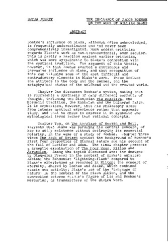 Boehme's influence on Blake, although often acknowledged, is frequently underestimated and has never been comprehensively investigated. Much modern criticism regards Blake's work as non-transcendental, even secular. This is partly a reaction against earlier criticism, which was more sympathetic to Blake's connection with the mystical tradition. The argument of this thesis, however, is that Boehme exerted a continuous and pervasive influence on Blake, and that recognition of this can illumine some of the most difficult and contradictory elements in Blake's work. These include the attitude to the body and the senses, and the metaphysical status of the selfhood and the created world. Chapter One discusses Boehme's system, noting that it represents a synthesis of many different currents of thought, including the Dionysian via negative. the Hermetic tradition, the Kabbalah and the Lutheran faith. It is emphasized, however, that his philosophy arose from intense mystical experience rather than academic study, and that he chose to express it in symbolic and mythological terms rather than rational concepts. Chapter Two, on The Marriage of Heaven and Hell, suggests that Blake was pursuing his central concern, of how to unify existence without destroying its essential polarity, in the wake of a study of Boehme, Chapter Three views The Book of Urlzen against the background of Boehme's first four properties of Eternal Nature and his account of the fall of Lucifer and Adam. The final chapter presents a synoptic examination of The Four Zoas. Milton and Jerusalem, Among the topics discussed are: the designs by Dionysius Freher in the context of Blake's unfallen Albion; the Behmenist 'lightning-flash' compared to Blake's experiences as recorded in Milton; the concept of eternity, shared by Boehme and Blake, which combined stasis and activity; Blake's use of the 'language of nature' in the context of the risen Albion, and the connection between Blake's figure of Los and Boehme's Mercurius, as transmitters of the divine Word.