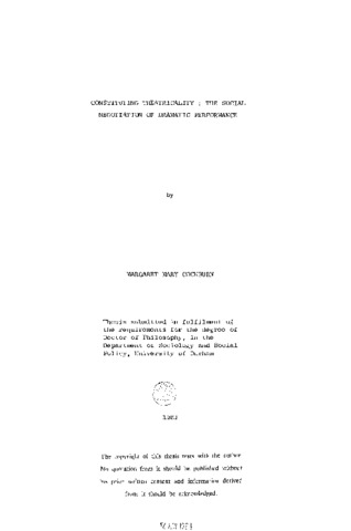 This thesis promotes a consideration of theatre as an essentially social skill rather than a dramatic one. It argues that theatre is dependent for its very existence on the social context and the available representational grammars which are firmly grounded in that context. It examines the theatrical experience through field work and a number of interviews with those involved in that experience. It considers the author and the basis and extent of his authority; the director and his perceived part in the production process; the history of criticism and the critics' current role; the actor and his relationship with the audience for whom he plays, and the ways in which the particular style of participation in performance is negotiated both at an acceptedly "theatrical" occasion and a situation where the definition of performance is pushed to its limits. It proposes that the study of theatricality, much hindered by the persistent and now cliched metaphor of life as theatre, is the study of sociality itself. The institution of theatricality is a set of patterned norms for representing social experience and this makes its study peculiarly pertinent to a sociological approach. It suggests that dramatic performance is the use of general interpretive modes for a particular reason, that being precisely to highlight that society consists of just such ways of being together.