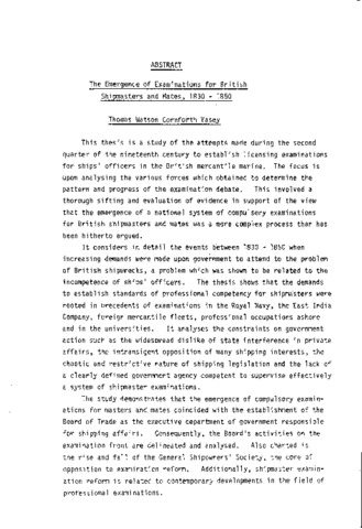 This thesis is a study of the attempts made during the second quarter of the nineteenth century to establish licensing examinations for ships' officers in the British mercantile marine. The focus is upon analysing the various forces which obtained to determine the pattern and progress of the examination debate. This involved a thorough sifting and evaluation of evidence in support of the view that the emergence of a national system of compulsory examinations for British shipmasters and mates was a more complex process than has been hitherto argued. It considers in detail the events between 1830 - 1850 when increasing demands were made upon government to attend to the problem of British shipwrecks, a problem which was shown to be related to the incompetence of ships' officers. The thesis shows that the demands to establish standards of professional competency for shipmasters were rooted in precedents of examinations in the Royal Navy, the East India Company, foreign mercantile fleets, professional occupations ashore and in the universities. It analyses the constraints on government action such as the widespread dislike of state interference in private affairs, the intransigent opposition of many shipping interests, the chaotic and restrictive nature of shipping legislation and the lack of a clearly defined government agency competent to supervise effectively a system of shipmaster examinations. The study demonstrates that the emergence of compulsory examinations for masters and mates coincided with the establishment of the Board of Trade as the executive department of government responsible for shipping affairs. Consequently, the Board's activities on the examination front are delineated and analysed. Also charted is the rise and fall of the General Shipowners' Society, the core of opposition to examination reform. Additionally, shipmaster examination reform is related to contemporary developments in the field of professional examinations.