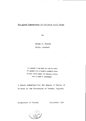 A survey of the soil algae present on old coal mine spoil heaps at East Holywell, Tyne and Wear (O.S sheet NZ 37 ref. 313730 ) was carried out during 1979-1980. Samples were taken at monthly intervals from eight permanent quadratso The sites chosen provided a range of spoil types, including some devoid of higher plants and others where colonization was well developed. Algae were isolated and their density quantified using a dilution plate technique A limited flora was recorded at favourable sites on both shale (15 genera) and washeries waste (19 genera). The density of algae in the spoil at sites which were stable, moist and had a pH of about 7 was comparable to that reported for a range of natural soils Seasonal fluctuations in algal density were recorded with a general increase in spring and late summer and a decrease in autumn and winter. A marked decrease in mid-summer which coincided with a period of drought was recored at several sites. At five of the eight sites both a small number of algal species and low population densities were recorded. This was ascribed to the extreme nature of the physical and chemical environment. Evidence was however obtained that at one site the soil algae were acting as primary colonizers.