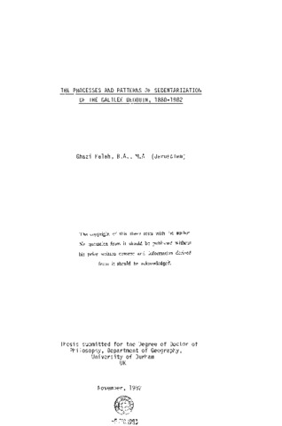 This study is the first comprehensive geographical research upon the bedouin tribes of Galilee. These tribal groups have been rather neglected in Literature and relatively little is known about them. It is hoped to contribute to the Settlement Geography of the Middle East and to shed some light on studies of the Holy Land, Settlement geography is defined for this study as having two basic aspects: 1) explaining the processes which have created the Bedouin settlement, and 2) describing the resultant settlement patterns. The most important period of sedentarization among the Galilee bedouin tribes is that of the first half of the 20th Century, although the processes of changing nomadic habits into sedentary ones were observed in earlier times. However, political and economic conditions of the country, as well as the weakness of the Central government of the Ottoman regime contributed much to the spread of nomadism into the non-desert environment of Galilee. However, the pattern of settlement among the Galilee bedouin is a recent phenomenon emerging largely during the past three decades. It has not yet reached its final shape. The study is divided into three parts, each part emphasizing one phase of the sedentarization process; the first part discusses the conditions under which the nomadism develops and the early symptoms of the denomadization process. The second part analyses the processes of sedentarization, and in the third part, the final product of sedentarization, the settlement patterns, are examined. The thesis ends with some concluding remarks summarizing the most significant general findings of this study and suggesting some further research for the future.