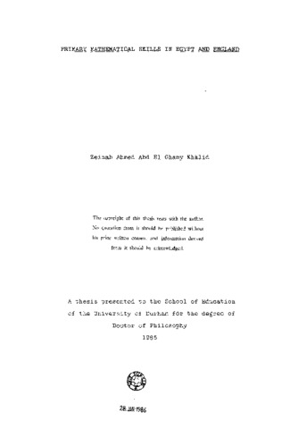 As the intention of this research was to investigate the acquiring of skills in mathematics in primary schools, Egypt (which is considered to be a developing Country) and England (considered to be an advanced country) were chosen to provide different ends of the scale. This piece of research is considered to be of high significance for a number of reasons: firstly, the acquiring of mathematical skills is an important aim in the school curriculum. Secondly, primary school level is an important stage as it is the basis for the other stages. Thirdly, Elementary school mathematical experience may serve in developing one's abilities to understand social institutions, and in equipping one to meet more effectively problems which occur in personal life. Fourthly, there is a deficiency in defining skills practically. Fifthly, there is a lack in evaluating skills objectively. A practical definition and classification of skills have been adapted, developed, and modified. Objective tests for evaluating skills have been designed for both Egypt and England. Children's performance in the test of skills has been analysed, and appropriate comparisons between Egyptian children and English children in acquiring skills have been made. General observations from the children's results have been made. It is hoped that this research will contribute in evaluating and improving the methods of teaching mathematics in primary school in general, and teaching mathematical concepts and skills in particular.