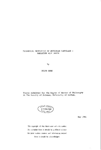 The response of human, adult articular cartilage to compressive loading has been investigated in this study. Full thickness specimens of patellar cartilage were subjected to compressive loading either in a Scanning Electron Microscope (SEN) or in one of the two conventional testing machines. Testing in the SEM meant that video recordings could be made of the deformation which occurred during loading, and subsequent analysis of these video recordings enabled the determination of the variation in the mechanical properties through the thickness of the cartilage. Testing of individual slices of cartilage and repeated testing of specimens reduced in thickness by the removal of successive slices of cartilage were performed in the conventional testing machines. The results of these tests also give an indication as to the variation in mechanical properties with depth. Results indicate that the compliance of normal patellar cartilage is highest in the superficial zone, decreases to a minimum in the mid-zone and increases again slightly in the deep zone. The full thickness tests were used to determine the effect (if any) of age, site of specimen, storage procedure and variations in water and uronic acid content on the response of the tissue. These results show that the compliance of articular cartilage is highly dependent on the age of the tissue, increasing with age, and that specimens stored at - 20ºC show, on average, a higher value of compliance than specimens stored at + 4ºC. No systematic variation in compliance of specimen with site was observed and there was no correlation between either water or uronic acid content and compliance.
