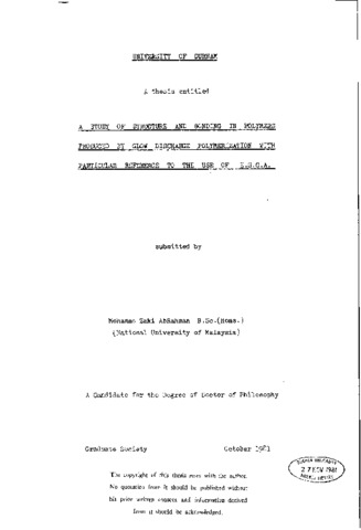 A study of structure and bonding in polymers produced by glow discharge polymerization with particular refrence to the use of E.S.C.A.