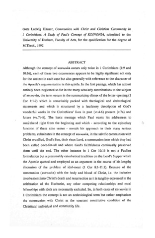 Communion with Christ and Christian community in 1 Corinthians: a study of Paul's concept of Koinonia