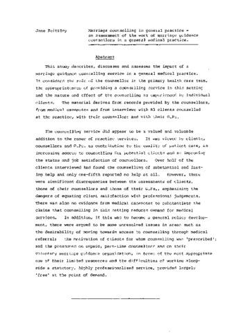This study describes, discusses and assesses the impact of a marriage guidance counselling service in a general medical practice. It considers the role of the counsellor in the primary health care team, the appropriateness of providing a counselling service in this setting and the nature and effect of the counselling as experienced by individual clients. The material derives from records provided by the counsellors, from medical casenotes and from interviews with 83 clients counselled at the practice, with their counsellors and with their CPs. The counselling service did appear to be a valued and valuable addition to the range of practice services. It was viewed by clients, counsellors and CPs. as contributing to the quality of patient care, as increasing access to counselling for potential clients and as improving the status and job satisfaction of counsellors. Over half of the clients interviewed had found the counselling of substantial and lasting help and only one-fifth reported no help at all. However, there were significant discrepancies between the assessments of clients, those of their counsellors and those of their CPs., emphasising the dangers of equating client satisfaction with professional judgements. There was also no evidence from medical casenotes to substantiate the claims that counselling in this setting reduces demand for medical services. In addition, if this was to become a general policy development, there were argued to be some unresolved issues in areas such as the desirability of moving towards access to counselling through medical referral? the motivation of clients for whom counselling was 'prescribed'; and the pressures on unpaid, part-time counsellors and on their voluntary marriage guidance organisation, in terms of the most appropriate use of their limited resources and the difficulties of working along side a statutory, highly professionalised service, provided largely 'free' at the point of demand.