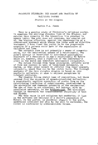 This is a genetic study of Holderlin's religious poetry. It examines the evolving atrophic form of the Elegies, and relates this directly to the transition from personal to hymnic lyric: the poet does not overcome, but creates out of, the elegiac situation. Against the impersonality of a predominant approach which treats the later work as objective statement, I have found the poetry to be the progressive creation of a private world made of the experiences of childhood and love. The strophic form is not primarily a means of communication, but the existential sphere of a relationship. The poem's message is restricted to autonomous paradigmatic enactment of a revolution in man's relationship to Nature which is, however, also a rejection of the individual's place in the world and therefore necessarily solipsistic. The method follows from these principles. Artistic unity of form and content is here of heightened intensity, in rhythm, so that ideas cannot be isolated from their context; conversely, where they can be the poetry fails. The thorough analysis of the five strophic elegies is based on this aesthetic criterion; it aims to replace paraphrase by literary criticism. The Elegies follow strict laws of composition, but these proceed from the opposite of speech-orientated reflection: a consistently negative conception of poetic form as the relativising limitation of consciousness, contradicted by the mysterious and daemonic intensity of the unconscious. The use of form is not classical, but belongs, with unparalleled extremity, to the Fruhromantik. The historical context is therewith the transcendental philosophy of Kant and Fichte. The true value is not religious but aesthetic; it lies in the softness and delicacy of a child's perception of Nature. As the poetry, in polemical example to the world, undermines intellect and will by the will to surrender, the reader is confronted by irreconcilable values.