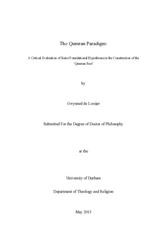 Abstract: This thesis is a critical study of some of the foundational hypotheses of the Qumran Paradigm. This Paradigm connects the archaeological site of Khirbet Qumran to, on the one hand, the manuscripts from the eleven caves in its vicinity and, on the other hand, the descriptions of the Essenes by Philo, Josephus and Pliny the Elder. Thus, the Qumran Paradigm hypothesises that the Qumran manuscripts reflect the ‘sectarian’ library of a radical minority group (or ‘sect’), which was closely connected to the Essenes and resided at Khirbet Qumran. Part of this group’s ideology is thought to be their self-identification as ‘the chosen righteous ones’, awaiting the eschaton. Their exclusivist self-understanding is perceived to be demonstrated by modes of separatism and dualistic thinking in the manuscripts of the group’s ‘library’. This thesis discusses several of the hypotheses that have formed the foundations of this prevalent Qumran Paradigm: the idea of a ‘ sectarian library’; literary and socio-historical models of textual classification; the use and accurateness of certain terminology to describe particular textual peculiarities (such as ‘dualism’); and finally, the implications of conclusions drawn from the perception of ideological coherence in the Qumran texts. First, this study evaluates the notions of a ‘sectarian’ library and a ‘sectarian’ group, and how these notions have influenced scholarly classifications of the Qumran texts. These classifications have constructed chronological models of 'sectarian' development, in the attempt to identify a correlation between text-ideology and social history. The validity of such mirror readings is discussed with regard to a crucially important, yet difficult to categorise, Qumran text, 4QMMT. The second part of this study focuses on the construction of social reality through the perception of ideological coherence, particularly with regard to the concept of ‘dualism’. We evaluate the expansion of its definition into ten types of ‘Qumran’-specific dualism. Subsequently, the concept of ‘dualism’ is discussed with regard to the Treatise of the Two Spirits (1QS iii 13 – iv 26), as its dualistically perceived ideas are analysed and compared to similar ideas in other texts. This study wants to critically evaluate those elements in the foundations of the Qumran Paradigm that prevent scholarship from theorising about possible social realities beyond the scholarly construct of the Qumran 'library' and 'sect'. Hence, it wishes to advocate a more revisionist approach that more fundamentally questions the foundations of the Paradigm, specifically for those texts that do not seem to ‘fit’ within the Qumran Paradigm and that allow us to consider whether the texts found at Qumran represent a wider range of social backgrounds and a fuller engagement with the diverse forms of Second Temple Judaism than is normally envisaged.