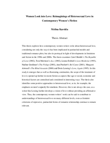This thesis explores how contemporary women writers write about heterosexual love, considering not only the ways it has been implicated in patriarchal models and traditional romance plots, but also its portrayal in light of developments in feminism and fiction in the 1990s and 2000s. The thesis examines Carol Shields’s The Republic of Love (1992), Toni Morrison’s Jazz (1992), Louise Erdrich’s Love Medicine (1993), Nadine Gordimer’s The Pickup (2001), Ann Patchett’s Bel Canto (2001), Margaret Atwood’s The Blind Assassin (2000) and Doris Lessing’s Love, Again (1995). In this study it emerges that as well as illustrating continuities, the scope of the treatment of love is opened up further in recent fiction as aspects like age or social, economic and historical factors are centralised and considered in interesting ways. The thesis also identifies some positive approaches to heterosexual love, as in, for example, the emphasis on men’s capacity for emotions. However, this is not always the case, as a writer like Lessing further develops a vision of love without providing an affirmative view. Thus, the contemporary women writers’ work can be said to contribute to understandings of heterosexual love on many different levels, even as feminist criticisms of repressive, patriarchal forms of romantic relationship continue to remain relevant.