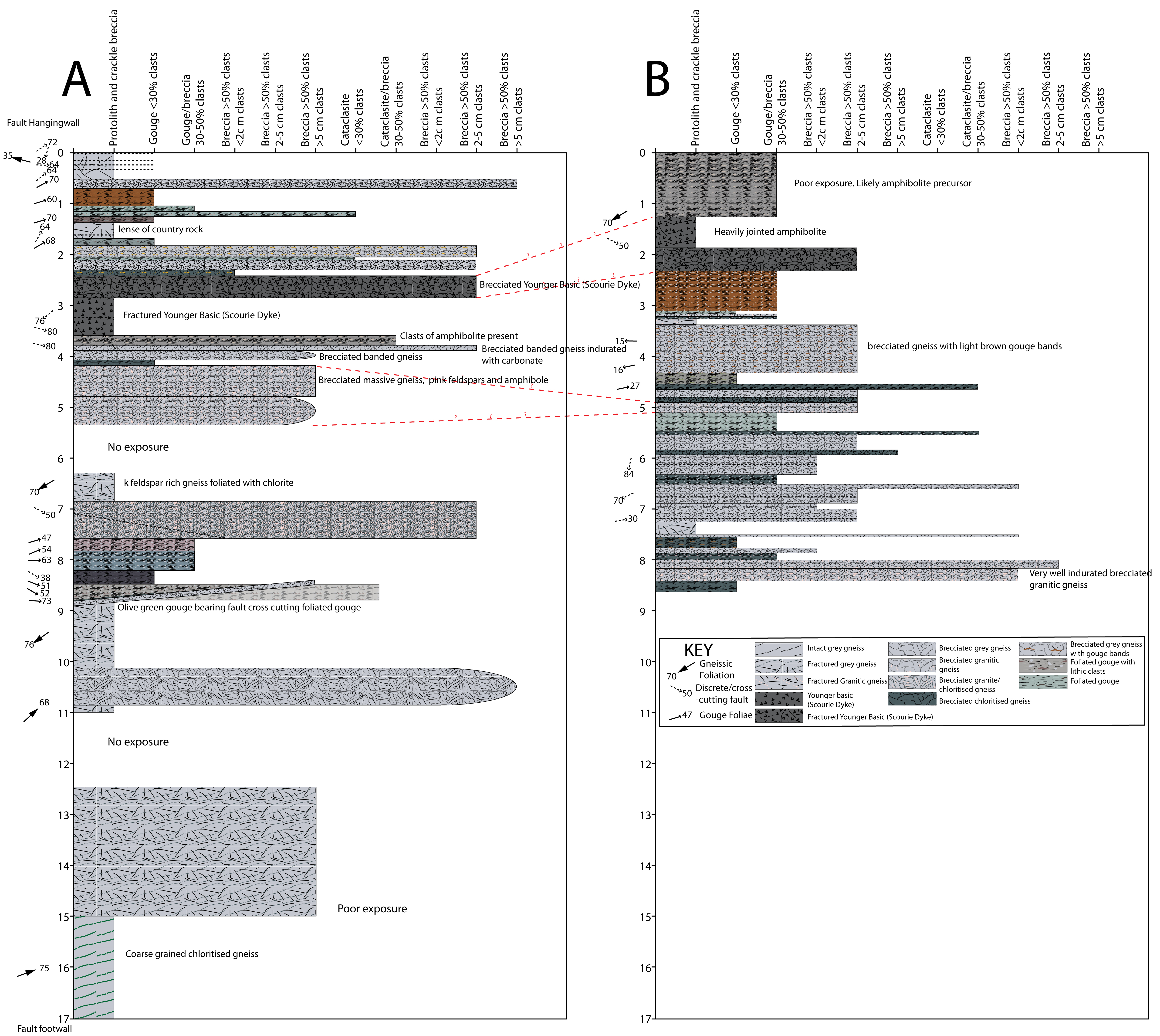 The Outer Hebrides are a structurally complex area, comprised predominantly of crystalline basement rocks of the Lewisian Gneiss Complex with the multiply reactivated Outer Hebrides Fault Zone following eastern portions of the islands for over 200 km along strike. In Eastern Lewis, the Permo-Triassic Stornoway Formation unconformably overlies Lewisian basement rocks of the OHFZ in a half-graben. This structural setting is analogous to the major offshore Clair oil field, where oil is found within Devonian-Carboniferous red beds of the Clair Group directly overlying Lewisian Gneiss Complex rocks of the Rona Ridge, which was upfaulted in the Mesozoic. Oil connection and flow has been proven in the basement rocks at Clair, however, little is known about the nature of fracturing and faulting within the basement and how these faults link to the cover sequence. Here, the cover and basement rocks of the Outer Hebridean Islands of Lewis and Harris are studied as an analogue. Faults, fault rocks and deformation are characterised within the Stornoway Formation, and at the basement-cover interface, allowing recognition of Mesozoic and younger faults within the Lewisian and their separation from older structures. Three fault sets are distinguished within the Stornoway Formation: a NNW-SSE striking normal fault set (Set 1); a N-S and E-W quadrimodal normal fault set (Set 2); and a less numerous late E-W strike-slip set (Set 3). Tertiary dolerite dyke intrusion occurred along Set 1 and Set 2 faults prior to the formation of Set 3. Palaeostress analyses reveal that Set 1 and 2 result from E-W and ENE-WSW directed extension vectors, followed by E-W directed contraction associated with Set 3. These orientations are interpreted to be representative of Mesozoic extension related to the opening of the Atlantic, followed by Cenozoic contraction. Faults in the Stornoway Formation are accompanied by development of authigenic clay-bearing gouges and cataclasites, ± calcite cement and late zeolite. Zeolite is often associated with secondary porosity, produced through dissolution of calcite. Mesozoic and younger faults are readily identified in Lewisian Gneiss rocks of the Stornoway region based on fault rock characterisation, and these faults also display an ENE-WSW directed extension vector. The major bounding faults of the Stornoway Formation are sub-parallel with the local foliation and the reactivation of the basement foliation by Mesozoic faults is proven. Fault trends identified within the Stornoway Formation are also sub-parallel with the local foliation. Conjugate faulting apparent in the Stornoway Formation is not present within the Lewisian, possibly indicating a degree of structural detachment between faulting in the basement and faulting in the cover, probably linked to the development of low-angle faults within the Stornoway Formation within metres of and parallel with the basement-cover unconformity. The basement-cover interface displays abundant evidence of fluid overpressure, potentially linked with dewatering during lithification and local fault movements. Mesozoic and younger-age brittle fault rocks post-date pre-existing extensive ductile and brittle deformation that are most intense within the OHFZ. Brittle fault rocks of pre-Mesozoic age are associated with pseudotachylites, fine grained cataclasites, epidote-bearing cataclasites and pumpellyite-bearing cataclasites. Mesozoic fault rocks contain authigenic clay-bearing gouges and cataclasites often associated with zeolite and adularia mineralisation that often accompanies the development of secondary porosity within the fault rocks. This chronological fault rock assemblage represents the continued exhumation of the islands after the successively lower temperature and pressures conditions experienced since the initial development of the basement gneiss complex. Across Lewis, fault rock characterisation allows identification of major Mesozoic and younger structures that cross the islands, with a km-scale offset postulated across the major Seaforth Fault that may link the major NE-SW striking Minch Fault to a NE-SW striking fault lying offshore western Lewis/Harris. On Lewis, the predominant orientation of Mesozoic structures is NNW-SSE, becoming NW-SE on Harris, south of the Seaforth Fault and where foliation becomes pervasively NW-SE. It seems highly likely that, as identified in the Stornoway Region, the foliation orientation plays a significant role in the development of later structures. At Clair, fault rock development within the Devonian-Carboniferous Clair Group is dependent on the host lithology, with gouges formed in mudstones, and granulation seams found in porous, oil-bearing sandstones. Calcite-cemented breccias are present in zones of calcite cemented host rock. Pyrite and calcite vein mineralisation are associated with oil influx, and a late phase of dissolution was accompanied by faulting that produced uncemented brittle fault rocks (gouge). In the basement, oil is seen along open fractures and in vug-like secondary porosity associated with adularia mineralisation, of which two forms are present. Euhedral adularia is often altered to green clay and partially to wholly infills tensile fractures that may predate the emplacement of the Clair Group. Later adularia occurs as ‘speckled’ veins, with haematite, clay, calcite, pyrite, minor zeolite and oil, and appears to be contemporaneous with calcite-pyrite veining (i.e. Mesozoic in age). Porosity in both adularia-bearing fractures is associated with oil staining. The basement displays little evidence of extensive mylonites or phyllonites that are obvious in the OHFZ of the Outer Hebrides. Scalability studies show that it is difficult to assign power-law spacing distributions to fractures within the basement rocks of the Hebrides. Fractures parallel with Mesozoic structures do however tend to display a greater degree of organisation with more clustering of fractures as the faults 