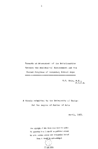 Towards an assessment of the relationships between the residential environment and the social progress of secondary school boys