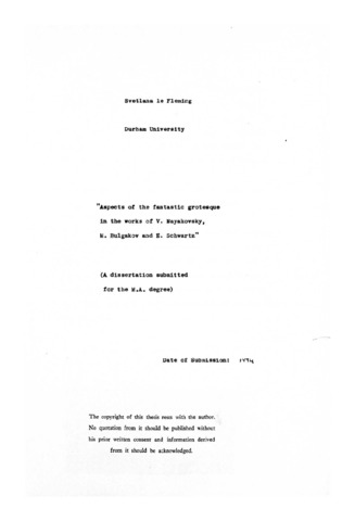 The grotesque in Soviet literature ls a field of study whlch has been neglected both in the Soviet Union and the West. In the Soviet Union interest in the grotesque reached a high point in the formalist criticism of the twenties, since the grotesque is one of the most clearly expressed devices of defamiliarisation. After a long period of taboo a revival takes place in the sixties. An attempt has been made in thls thesis to define the grotesque and to apply this definition to the works of V. Mayakovaky, M. Bulgakoy and E. Schwartz. We are primarily concerned with the structural features of their grotesque and the relationshlp of these to comedy and tragedy. While very similar in its structure and its use of comedy devices, the grotesque of all three writers differs substantially in its nature. We have attempted to establish the reasons for the differences and to define the function of their grotesque.