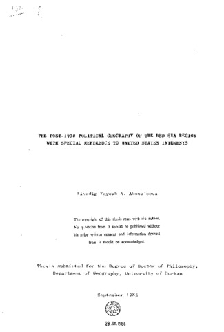 This is a pioneer and comprehensive study of the political geography of the Red Sea region. Background studies on geopolitics, physical environment, and resources are offered. The thesis is especially concerned with three basic American interests in the Red Sea. Firstly, energy interest: United States deep concern about uninterrupted flow of oil supplies from the Gulf to the former as well as to its Western allies creates an increasing American interest in the Red Sea route, particularly since the Gulf tanker war in 1982. Such interest is clearly seen in United States political, technical, and financial involvement in the Suez Canal (1975) and in the current laying of pipelines from the Gulf to the Red Sea. Disruption of those supplies to the US or its allies may result in American use of force. Secondly, shipping interest: such concern is clearly shown in United States involvement in matters relating to the Suez Canal, the Straits of Bab al Mandeb and Tiran. Freedom of navigation through the Red Sea, especially for Israeli ships, is a major American interest in this respect. United States refusal to sign the 1982 UN Convention on the Law of the Sea may involve the former into conflict with some Red Sea States, particularly when American nuclear-powered vessels sail from the Mediterranean to the Indian Ocean or vice versa. Thirdly, Soviet involvement in Afghanistan, the Gulf war and the resurgence of Islam are becoming increasingly worrying to the US, because such developments are feared as a destabilizing factor to the stability of the oil producing states of the Arabian peninsula, with particular reference to Saudi Arabia, the most important Red Sea state.