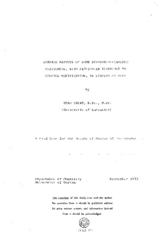 x-ray photoelectron spectroscopy (ESCA) has been used to investigate the surface chemistry of a variety of elastomers, as a function of cure conditions. The surface composition of thickness on a depth scale in the range < 50Å depends on the cure conditions and the bulk formulations of polyisoprene (Natsyn 2200), styrene/butadiene (Solprene 1204) and acrylonitrile/butadiene (Krynac 34/50) elastomers. In all cases, higher levels of antioxidant and accelerators have been detected at the surface than in the bulk, whilst the level of zinc for Natsyn 2200 and Solprene 1204 systems increases with ESCA depth profile into the bulk. The samples of Krynac 34/50 indicated higher levels of zinc and cadmium in the surface regions and, in one case, the level of zinc at the surface is approximately the same as in the bulk. Zinc and cadmium in the surface regions are predominantly present as sulphides. A use of the 'swelling' data has been made, in conjunction with the ESCA data, to estimate the sulphur functionality. Particular emphasis has been placed on the elaboration of surface crosslink functionality, using inductively coupled radio-frequency glow discharges, excited in oxygen and hydrogen. Model studies to establish the changes in surface chemistry as a function of reaction time in plasmas have been carried out in conjunction with the type 1, Natsyn 2200, elastomers. The results show that the reactions with oxygen and hydrogen plasmas are by no means simple. Modification by the oxygen containing plasmas is extensive but confined to the outermost monolayer or so. The rate and extent of oxidation is a strong function of the initial surface chemistry of the samples. The level of sulphur in di- and trisulohide models is essentially the same before and after oxygen plasma treatments and the tetrasulphide model indicated a loss of sulphur by a factor of two. The optimum cured type 1, Natsyn 2200, sample did not indicate any tendency for a loss of sulphur under comparable conditions. For hydrogen plasmas, the level of sulphur in a disulohide model system remains essentially the same, whereas the trisulphide model and the type 1, Natsyn 2200 systems indicated a loss of sulphur-A thermal oxidation study has also been carried out on the optimum cured type 1, Natsyn 2 200, elastomers and the results are complementary in some respects to oxygen plasma treatments .Finally, the 'sulphur-vulcanised' elastomers have been treated with the thiol-amine reagents for determining the relative proportion of mono-, di- and polysulphide cross links but the results are additionally complicated by the incorporation of thiol and amine into the elastomers.
