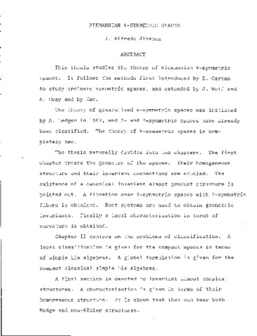 This thesis studies the theory of Riemannian 4-symmetric spaces. It follows the methods first introduced by E. Cartan to study ordinary symmetric spaces, and extended by J. Wolf and A. Gray and by Kac. The theory of generalized n-symmetric spaces was initiated by A. Ledger in 1967, and 2- and 3-symmetric spaces have already been classified. The theory of generalized n-symmetric spaces is completely new. The thesis naturally divides into two chapters. The first chapter treats the geometry of the spaces. Their homogeneous structure and their invariant connections are studied. The existence of a canonical invariant almost product structure is pointed out. A fibration over 2-symmetric spaces with 2-symmetric fibers is obtained. Root systems are used to obtain geometric invariants. Finally a local characterization in terms of curvature is obtained. Chapter II centres on the problems of classification. A local classification is given for the compact spaces in terms of simple Lie algebras. A global formulation is given for the compact classical simple Lie algebras. A final section is devoted to invariant almost complex structures. A characterization is given in terms of their homogeneous structure. It is shown that they can bear both Hodge and non-Kahler structures.