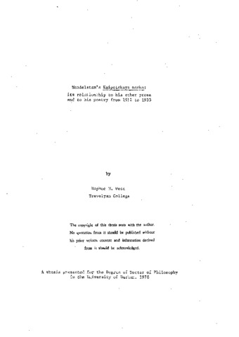 Mandelstam’s Egipetskaya marka: its relationship to his other prose and to his poetry from 1912 to 1933