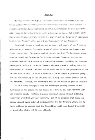The role of the Treasury in the formation of British economic policy in the period 1918 to 1925 is one of considerable interest, both because the economic problems which confronted the British Government at this time were many, complex and often without close historical parallel, and because there was a considerable contrast in both the quality and the duration of experience between the Treasury officials and the Chancellors of the Exchequer. This study begins by studying the structure and nature of the Treasury, and goes on to examine five major- areas of policy in which the' Treasury was closely concerned. The topics studied include the Cunliffe Committee, whose reports formed the foundation for British post-war financial policy; the problems involved in a return to a peace-time economy, including the 'economy campaign' of mid-1919, in which Treasury advisers played a leading role; the development of inter-Allied debt policy which led up to the publication of the Balfour Note in 1922, in which a Treasury official played a prominent part; and the restructuring of the National Debt during this period carried out by the Treasury. Finally, the Treasury's role in the return to gold is examined. It is evident throughout that the Treasury's primary concern in the discussion of any policy was its desire to return to the Gold Standard with all possible speed. Further, Treasury officials always advised following historical precedent wherever possible. But it is apparent that there was strong support among informed contemporaries for the Treasury views, nor is there evidence to suggest that the Chancellors would have looked favourably on unorthodox advice had it been offered.