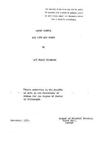 During the second half of the 9th/15th century Ahmad Zarrug al-fasi lived, a jurist and a Sufi. As an intellectual and the founder of a Aufi Order, his impact was felt in the realm of literature and among the masses. He is considered to be one of the Orthodox Sufi masters whose concern was largely directed towards alleviating the misunderstanding which has occurred is Islamic thought between Juris-prudence and Sufism. This thesis deals with Zarruq’s activities and his influence as a Sufi. It is composed of an introduction and five chapters. The introduction explains the historical, social and academic circumstances in his native city, Fez, in which Zarruq passes his early years, of which he was part. The first chapter is concerned with his life, his education, travels and his contact with Sufism, until he does in Misurata, far away from his own country. The second chapter contains a catalogue of his works, such as exist in manuscripts or editions, or have been cited. There is also a brief analysis of Zarruq the author and of aspects of his authorship, with a classification of his works and commentaries by others on them; also a table of datesof some of his works. The third traces the Order which founded, his position among the various Sufi Orders, and his relation to the Shadhiliyah. It also contains a historical survey of the Zarruqiyah and its Zawiyahs, its branches, principles and teachingSo The fourth examines the principal Sufi ideas as ZarriSq. interpreted them from a sunnI point of view, in theory and in practice. The fifth chapter is concerned with him as a Sufi critic and some aspects of his criticism in regard to following the Way and the obligations of both the seeker and the master with respect to the sunnI concept of Sufism in belief and action. The thesis contains 10 illustrations.