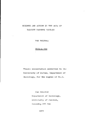 A science of action has traditionally been associated with a range of methodological problems. Parsons' exposure to German idealism gave him an awareness of such problems. The question examined by this study is how Parsons addresses and attempts to resolve three methodological problems in a science of action; the nature of subjectivity, the relationship of normative entities and action and the place of values in knowledge. Central to the argument pursued here is that Parsons formulates and answers these problems within the interrelated framework of his analytical conception of science and his voluntaristic metaphysic. Chapters II and III are concerned with The Structure of Social Action, In the first, Parsons' general methodology of science is outlined leading up to his understanding and reasons for 'structural analysis': the importance of systematically articulated schemes of general elements of action. In chapter III Parsons' voluntarism is analyzed before examining the three problems noted above and showing their relationship to the analytic/voluntaristic framework. Chapters IV and V follow through these themes into Parsons’ work between 1938 and 1950 when he explicitly adopts a structural functional approach. Chapter IV returns to general methodology and Parsons’ rationale for structural functionalism but notes a number of anomolies in this which lead to chapter V in which structural functionalism is considered in the light of methodological problems of a science of action. Here the close relationship between voluntarism and structural functionalism is stressed. In conclusion alternative interpretations of voluntarism are critically assessed and a closing comment on Parsons’ contribution to sociological theory is offered.