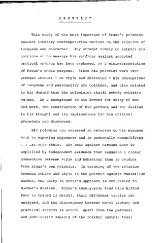 This study of the most important of Kraus's polemics against literary contemporaries centres on the relation of language and character. Any attempt simply to extract his opinions or to measure his verdicts against accepted critical opinion has been eschewed, as a misinterpretation of Kraus's whole purpose. Since his polemics were two- pronged attacks - on style and character - his conceptions of language and personality are outlined, and also related to his demand that the polemicist should embody artistic values. As a background to his demand for unity of man and work, the construction of his persona and the dualism in his thought and its implications for his critical procedure are discussed. His polemics are assessed in relation to his success both in exposing opponents and in personally exemplifying his artistic ethic. His case against Hermann Bahr is amplified by independent evidence that suggests a closer connection between style and behaviour than is evident from Kraus's own polemics. In treating of the relation between ethics and style in the polemic against Maximilian Harden, the unity in Kraus's approach is contrasted to Harden’s dualism. Kraus's twenty-year feud with Alfred Kerr is traced in detail, their different tactics are analysed, and the discrepancy between moral victory and practical success is noted. Apart from the personal and publicistic aspects of the polemic against Franz Werfel, the crucial questions it raises as to the validity of Kraus's linguistic formula are discussed. This was relevant to polemical demands, but rather rigid, as particularly the Werfel case shows; Kraus did not investigate all significant manifestations of character in style. Against Stefan George he failed to exemplify his ideal of unity, in that his individual criticisms of George’s translations of Shakespeare's Sonnets are valid, but his own versions fall short of the perfection required to vindicate his polemical position.