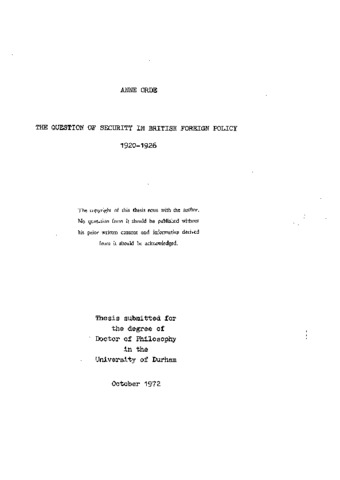 The subject is the formation of official British policy on international security between the entry into force of the Treaty of Versailles and Germany's entry into the League of Nations, and defence policy in relation to foreign policy. The problem of security in these years, for Britain, falls into three parts: international security in the broadest sense; the security of areas of the world of importance to Britain and the Empire; and the security of Britain and the Empire itself. International security in the broadest sense was largely a matter of the development of the League of Nations, The attitude of British Governments to the obligations of the Covenant and the rejection of the attempts of 1922-24 to give them greater precision, are shown to have been much influenced by the abstention of the United States from membership of the League and by the position of the Dominions, In terms of "foreign policy the areas of greatest importance for regional security were western Europe and the Far East, The problem of western European security is traced from the unsuccessful negotiations of 1921-22 for an Anglo-French pact to the apparent solution at Locarno; that of the Far East from the early discussion of the future of the Anglo-Japanese alliance through the Washington Conference to the problems of developing the Singapore base. Defence policy was, it is shown, more closely related to foreign policy in the Far East than in Europe, The security of France and Belgium was generally regarded as a British interest; but danger was nowhere imminent and economy was a paramount consideration. The solutions sought were political rather than military: no commitment was undertaken in the Far East; and when Britain finally accepted one in Western Europe no provision for its fulfilment was considered.
