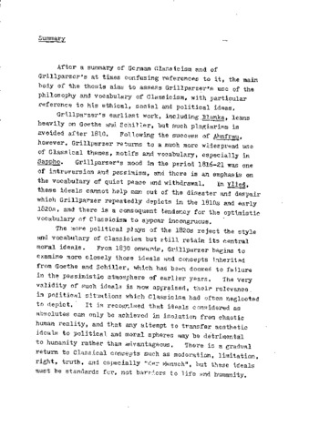 After a summary of German Classicism and of Grillparzer's at times confusing references to it, the main body of the thesis aims to assess Grillparzer's use of the philosophy and vocabulary of Classicism, with particular reference to his ethical, social and political ideas.Grillparzer'8 earliest work, including Blanka, leans heavily on Goethe and Schiller, but such plagiarism is avoided after 1810. Following the success of Ahnfrau, however, Grillparzer returns to a much more widespread use of Classical themes, motifs and vocabulary, especially in Sappho. Grillparzer's mood in the period 1816-21 was one of introversion and pessimism, and there is an emphasis on the vocabulary of quiet peace and withdrawal in Vließ, these ideals cannot help man out of the disaster and despair which Grillparzer repeatedly depicts in the 1810s and early 1820s, and there is a consequent tendency for the optimistic vocabulary of Classicism to appear incongruous. The more political plays of the 1820s reject the style and vocabulary of Classicism but still retain its central moral ideals. From I830 onwards, Grillparzer begins to examine more closely those ideals and concepts inherited from Goethe and Schiller, which had been doomed to failure in the pessimistic atmosphere of earlier years. The very validity of such ideals is now appraised, their relevance in political situations which Classicism had often neglected to depict. It is recognised that ideals considered as absolutes can only be achieved in isolation from chaotic human reality, and that any attempt to transfer aesthetic ideals to political and moral spheres may be detrimental to humanity rather than advantageous. There is a gradual return to Classical concepts such as moderation, limitation, right, truth, and especially "der Mensch", but these ideals must be standards for, not barriers to life and humanity.