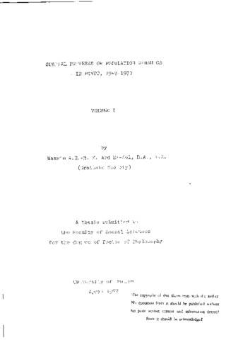 The objective of this study is to analyse spatial patterns of population dynamics in Egypt during the period 1947-70. It is hoped that this may assist in the understanding of the processes underlying demographic change in Egypt and so provide a firmer foundation for future national planning. The main body of the thesis begins in Chapter Two with an overview of Egypt's population growth, with special emphasis on the regional differentials. In the following chapters the analysis of population change becomes more detailed. In Chapter Three the first component of population growth, namely fertility, has been dealt with. In Chapter Four, mortality, the second component, has been discussed, while Chapter Five deals with age and sex structure. Chapter Six examines internal migration, which is extremely important because it concerns the ever-growing concentration of people in Egypt's largest cities, especially Cairo, a concentration which gives rise to some of Egypt’s most serious social and economic problems. This chapter leads into a more specific discussion of the uneven population distribution within the country. Chapter Eight deals with urbanization snowing that Egypt: suffers from over-urbanization, as the rural population continues to flood into urban centres. The concluding chapter examines government policy regarding population change and development. Volume II contains all the basic population data relevant to the thesis.