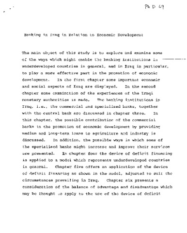 The main object of this study is to explore and examine some of the ways which might enable the banking institutions in underdeveloped countries in general, and in Iraq in particular, to play a more effective part in the promotion of economic development. In the first chapter some important economic and social aspects of Iraq are displayed. In the second chapter some examination of the experiences of the Iraqi monetary authorities is made. The banking institutions in Iraq, i.e., the commercial and specialised banks, together with the central bank are discussed in chapter three. In this chapter, the possible contribution of the commercial banks in the promotion of economic development by providing medium and long-term loans to agriculture and industry is discussed. In addition, the possible ways in which some of the specialised banks might increase and improve their services are presented. In chapter four the device of deficit financing is applied to a model which represents underdeveloped countries in general. Chapter five offers an application of the device of deficit financing as shown in the model, adjusted to suit the circumstances prevailing in Iraq. Chapter six presents a consideration of the balance of advantage and disadvantage which may be thought to apply to the use of the device of deficit financing, especially when it is agreed that one of the possible outcomes is inflation. This is followed by chapter seven where the conclusions and recommendations reached in the light of the study are set out. We then have six appendices, including a statistical one. The main conclusions are: 1. It may be worthwhile for monetary authorities to consider, very carefully, the possibility of using the device of deficit financing, under certain conditions and within specified limits.2. In calculating changes in prices the categories of the Quantity Theory of the Value of Money can be usefully employed, particularly if an attempt is made to introduce dynamic elements into the Fisher framework, as is done in this study.3. It need not be held that moderate inflation must, necessarily, turn into high and hyper-inflation.4. The commercial banks in under developed countries should give favourable consideration to the making of medium and long-term loans to agriculture and industry.5. Under normal conditions, particularly of international trading, Iraq may be thought to be in a more favoured position to adopt the suggestions set out in (1) and (4) above, than most other underdeveloped countries. These are perhaps all the more significant for Iraq in that the natural resource, oil, which provides opportunity, is a diminishing or wasting asset.