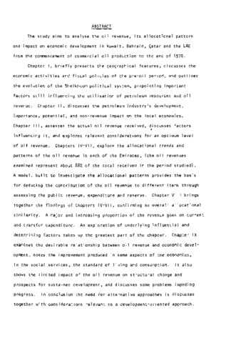 The study aims to analyse the oil revenue, its allocational pattern and impact on economic development in Kuwait, Bahrain, Qatar and the UAE from the commencement of commercial oil production to the end of 1970. Chapter I, briefly presents the geographical features, discusses the economic activities and fiscal policies of the pre-oil period, and outlines the evolution of the Sheikhdom political system, pinpointing important factors still influencing the utilisation of petroleum resources and oil revenue. Chapter II, discusses the petroleum industry's development, importance, potential, and non-revenue impact on the local economies. Chapter III, assesses the actual oil revenue received, discusses factors influencing it, and explores relevant considerations for an optimum level of oil revenue. Chapters IV-VII, explore the allocational trends and patterns of the oil revenue in each of the Emirates, (the oil revenues examined represent about 88% of the total received in the period studied). A model, built to investigate the allocational patterns provides the basis for deducing the contribution of the oil revenue to different items through assessing the public revenue, expenditure and reserve. Chapter VIII brings together the findings of Chapters IV-VII, confirming an overall allocational similarity. A major and increasing proportion of the revenue goes on current and transfer expenditure. An exploration of underlying influential and determining factors takes up the greatest part of the chapter. Chapter IX examines the desirable relationship between oil revenue and economic development, notes the improvement produced in some aspects of the economies, in the social services, the standard of living and consumption. It also shows the limited impact of the oil revenue on structural change and prospects for sustained development, and discusses some problems impeding progress. In conclusion the need for alternative approaches is discussed together with considerations relevant to a development-oriented approach.