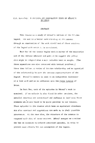 This thesis is a study of Boreal's version of the Tristan legend. Its aim is a better understanding of the romance through an examination of the work itself and of those versions of the legend with which it is associated. Part One of the thesis begins with a survey of the manuscript and of the various editions and goes on to suggest the policy that might be adopted when a more reliable text is sought. (The three appendices are also concerned with textual problems.) There then follow - a review of Tristan scholarship and an appraisal of the relationship between the various representatives of the legend. Beroul's romance is seen as an independent derivative of a lost work and as an influence upon the Folie Tristan of Berne. In Part Two, each of the episodes in Beroul's work is examined. If an episode is also found in other versions, the parallel accounts are scrutinized and emphasis is laid upon those elements which are found to be quite peculiar to our romance. Those episodes in the romance which have no equivalent elsewhere are also examined and suggestions are made as to their possible provenance. At the same time, the structure of the romance is compared with that of other versions. Beroul emerges as a writer who has on occasion re-ordered inherited episodes, in order to present more clearly his own conception of the legend. In the Conclusion, the significance of the parallel versions is ascertained, before Beroul's own conception of the legend is determined. Beroul consistently presents Tristan and Iseut as guilty sinners, but who are yet never beyond redemption, and he draws on theological support in order to suggest that by the end of the romance they are set on the road to salvation.