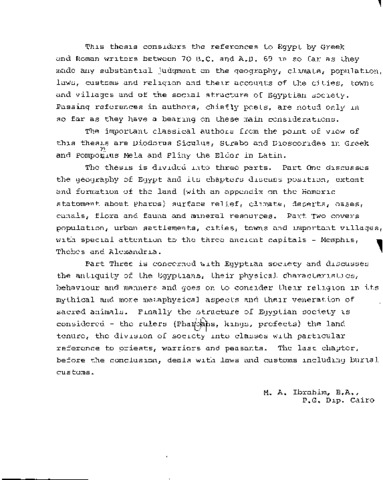 This thesis considers the references to Egypt by Greek and Roman writers between 70 B.C. and A.D. 69 in so far as they made any substantial judgment on the geography, climate, population laws, customs and religion and their accounts of the cities, towns and villages and of the social structure of Egyptian society. Passing references in authors, chiefly poets, are noted only in so far as they have a bearing on these main considerations. The important classical authors from the point of view of this thesis are Diodorus Siculus, Strabo and Dioscorides in Greek and Pomponius Mela and Pliny the Elder in Latin. The thesis is divided into three parts. Part One discusses the geography of Egypt and its chapters discuss position, extent and formation of the land (with an appendix on the Homeric statement about Pharos) surface relief, climate, deserts, oases, canals, flora and fauna and mineral resources. Part Two covers population, urban settlements, cities, towns and important villages, with special attention to the three ancient capitals - Memphis, Thebes and Alexandria. Part Three is concerned with Egyptian society and discusses the antiquity of the Egyptians, their physical characteristics, behaviour and manners and goes on to consider their religion in its mythical and more metaphysical aspects and their veneration of sacred animals. Finally the structure of Egyptian society is considered - the rulers (Pharoahs, kings, prefects) the land tenure, the division of society into classes with particular reference to priests, warriors and peasants. The last chapter, before the conclusion, deals with laws and customs including burial customs.