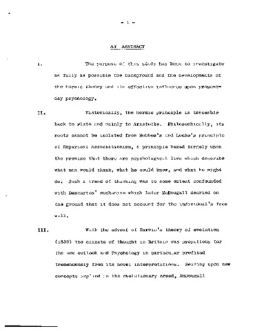 The purpose of this study has been to investigate as fully as possible the background and the developments ofthe hormic theory and its effective influence upon present day psychology. II. Historically, the hormic principle is traceableback to Plato and mainly to Aristotle. Philosophically, its roots cannot be isolated from Hobbes's and Locke's principleof Empirical Associationism, a principle based largely upon the premise that there are psychological laws which describewhat man would think, what he could know, and what he might do. Such a trend of thinking was to some extent confoundedwith Descartes mechanism which later McDougall decried on the ground that it does not account for the individual's freewill. III. With the advent of Darwin's theory of evolution (1859) the climate of thought in Britain was propitious f orthe new outlook and Psychology m particular profited tremendously from its novel interpretations. Seizing upon newconcepts implied in the evolutionary creed, McDougall efficiently introduced the hormically, motivational Psychology. IV, Unlike the mechanistic contentions, the dynamic hormic theory emphasises the nature of the organism's behaviour; i,e, nature endows the individual with a remarkable constitution which purposively produces or attempts to produce the right kind of behaviour and the appropriate type of mental attitude. Motivation therefore emerges from within and brain is the source of the intellect, of thinking, of ideas as well as it is the organ of motivation, Ethological and biological observations as well as modern Psychological techniques have favourably endorsed McDougall's hormic position, V, What gives the hormic theory supremacy over the rival ones is that it maintains a kaleidoscopic, voluntary explanation of behaviour and retains in its philosophy spirituality, rationality and the purposefulness of life. It has been found, besides other major characteristics, that in its present implications and psychological applications, the hormic theory has now experimental support, is viable and highly influential.