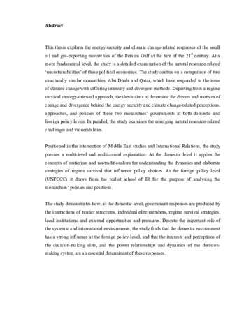 This thesis explores the energy security and climate change-related responses of the small oil and gas-exporting monarchies of the Persian Gulf at the turn of the 21st century. At a more fundamental level, the study is a detailed examination of the natural resource-related ‘unsustainabilities’ of these political economies. The study centres on a comparison of two structurally similar monarchies, Abu Dhabi and Qatar, which have responded to the issue of climate change with differing intensity and divergent methods. Departing from a regime survival strategy-oriented approach, the thesis aims to determine the drivers and motives of change and divergence behind the energy security and climate change-related perceptions, approaches, and policies of these two monarchies’ governments at both domestic and foreign policy levels. In parallel, the study examines the emerging natural resource-related challenges and vulnerabilities. Positioned in the intersection of Middle East studies and International Relations, the study pursues a multi-level and multi-causal explanation: At the domestic level it applies the concepts of rentierism and neotraditionalism for understanding the dynamics and elaborate strategies of regime survival that influence policy choices. At the foreign policy level (UNFCCC) it draws from the realist school of IR for the purpose of analysing the monarchies’ policies and positions. The study demonstrates how, at the domestic level, government responses are produced by the interactions of rentier structures, individual elite members, regime survival strategies, local institutions, and external opportunities and pressures. Despite the important role of the systemic and international environments, the study finds that the domestic environment has a strong influence at the foreign policy-level, and that the interests and perceptions of the decision-making elite, and the power relationships and dynamics of the decision-making system are an essential determinant of these responses.