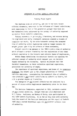 The Anglican view of authority, set out in her more recent official documents, owes much to the influence of liberal Catholicism; more especially to that of the generation younger than Gore who had themselves been influenced by the concept of authority espoused by certain Roman Catholic modernists. Radical movements in philosophy, literature, and science during the eighteenth and early nineteenth centuries created a climate of suspicion and doubt. By the mid-nineteenth century the accepted view of authority within Anglicanism could no longer sustain the weight placed upon it by the effects of these movements. Liberal Catholicism emerged in the l880's with a view of authority which allowed a certain liberality for the exploration of new ideas without compromise to the historic and catholic basis of Anglicanism. Within Roman Catholicism the modernist Tyrrell was opposing the official concept of authority which imposed upon the faithful dogmas defined by the hierarchy. Tyrrell maintained that the faithful themselves, in their collective spiritual experience, guaranteed the authority of dogma. The importance of spiritual experience, and hence of the consensus fidelium, was siezed upon by the younger generation of liberal catholic Anglicans, Incorporating the modernist view of authority they produced a neo-liberal Catholicism as catholic as Gore's, but with a greater degree of liberality. The emergence of neo-liberal Catholicism was catalysed by a ' period of crisis within Anglicanism immediately prior to the Great War. The Doctrine Commission, appointed in 1922, included a number of neo-liberal Catholics. Amongst them was A.E.J.Rawlinson and Will Spens, Rawlinson, as Bishop of Derby, also participated in the 1948 Lambeth Conference. In so far as they deal with authority both the report of the Doctrine Commission and the report of Lambeth 1948 show a marked dependence upon the neo-liberal catholic view of authority.