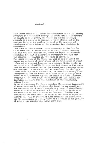 This thesis examines the nature and development of social security provision in a capitalist society. It begins with a consideration of poverty as wage labour, and traces the origins of social security as a response by successive ruling classes and by the emerging State to the problems involved in the creation and maintenance of wage labour in the transition from feudalism to capitalism. This theme is then continued in an examination of the Poor Law as an instrument of labour discipline through to and including the 1834, Poor Law amendment Act, where the impact of industrial capitalism not only on poverty and unemployment but also upon the structure of politics and the State is discussed. The second section of the thesis examines in closer detail the causes and problems of unemployment and the development of social reform and of national Insurance as a response to the problem in the period from 1880-1911. It is argued that it was in this period that the characteristic form of the present social security system was developed. In particular the New Liberalism, the ideology of social democracy and of citizenship, the attempt at working class incorporation, and the extension of State activity through social reform as an alternative against the threat of a more fundamental challenge to existing social relationships and inequalities are identified as having laid the foundation of the contemporary Welfare State. By way of conclusion the thesis considers the post-war development of social security from the Bevaridge Report to the present day. The continuing use of social security as a means of strengthening labour discipline is examined, and the political implications of its structure and administration arc discussed. Finally, some conclusions are drawn about the nature of the State in capitalist society, it's role in preserving class divisions and inequalities, and the limitations of social reform as a solution to the problems of poverty and unemployment within capitalism.