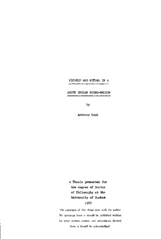 Fieldwork carried out in the Tirunelvell District of Tamil Nadu, South India, has led to the delineation of a 'micro-region’ of three agricultural villages This micro-region acquires its sociological unity by virtue of a system of inter-caste relationships and prestations which embraces all these villages and which manifests itself equally in the religious, economic, political and administrative spheres. In particular, the various specialist caste-groups perform their respective services for clienteles made-up of all or part of the population of the micro-region concerned. One aspect of each specialist's duty is his role in the life-crisis rituals of his clients. These rituals are themselves subsequently re-examined from the opposite perspective, namely with reference to the intra-caste relationships which they bring into play. Particular attention is paid to female puberty rites and to marriage; these are considered as a single ritual complex, concerned with caste purity and the legitimation of off-spring. The phenomenon of marriage between a man and his elder sister’s daughter is examined. There is a discussion of the problems which this practice raises for the conventional view of the 'Dravidian' marriage system, and an alternative structure is suggested for the kinship terminology in the present case. It is argued throughout that the problems being considered are best approached from a sociological, structural perspective, and a three-level model of social reality is adapted for this purpose. As a complement to this, the study concludes with a critique of the recently-advanced 'cultural' and 'ethnosociological' approaches in South Asian anthropology.