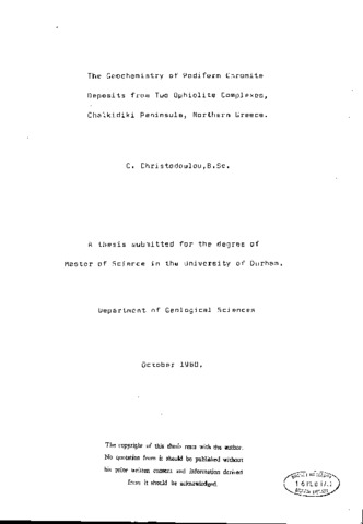 The geochemistry of various petrological units from two mafic-ultramafic complexes, from the Chalkidiki peninsula have been studied. These complexes have been tectonically incorporated into the metamorphic country rocks, forming allochtonous bodies bounded by thrust zones. Chromite deposits occur in both complexes. They are highly sheared in the Gomati complex but grade to host dunite in the Vavdos complex. Major oxide contents and trace element abundances have been determined by X-ray fluorescence spectrometry, mineral analyses have been made by electron microprobe. Data on chromite from both complexes reveal that the chromite ores are of metallurgical type in the Wades complex and of refractory type at Gomati. The genetic model proposed relates to extraction of basaltic melt from depleted upper mantle material and its subsequent fractional crystallization. Podiform chromites are an early product of the crystallization of such a basaltic melt. They are intimately associated with a dunite host rock. The structures of the petrological1y different rock units, suggest formation through processes involving an original magmatic environment. This is reinforced by trends for particular minerals in the Vavdos complex. In the Gomati complex, the rocks are extensively serpentinized although various rock types can still be recognized. Amphibolites, at the contacts to the country rocks, show similarities to ocean floor basaltic extrusives. The two mafic-ultramafic have been interpreted as ophiolitic complexes, generated in small ocean basins or maginal seas, and emplaced inot the crust during the Mesozoic.